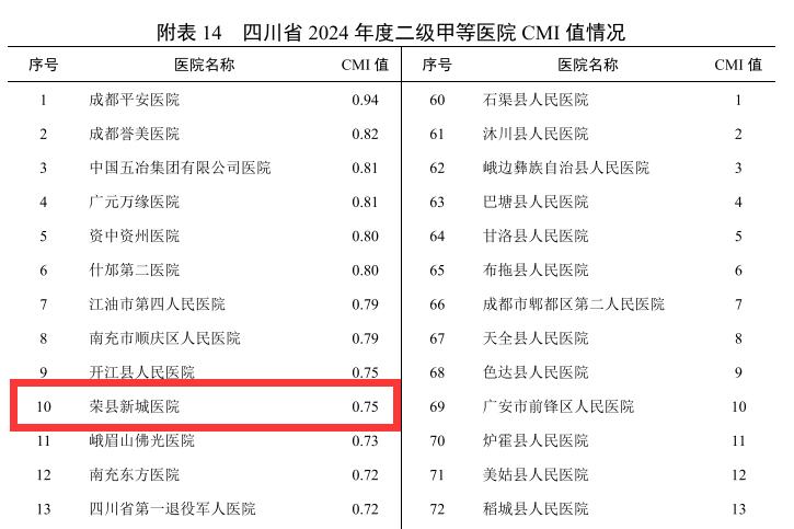 近日,四川省卫生健康委员会正式发布《2024年四川省医疗服务与质量报告》。全省117家二级甲等综合医院中,荣县新城医院在难度系数(CMI)、服务产出能力(总权重RW)、诊疗病种广度(DRG组数)等多个关键维度上均表现突出,服务能力、服务效率、医疗安全等综合实力指标连续稳居省内同级医院前列,生动诠释了其“技术强、服务优、效率高、负担轻”的高质量发展内涵。