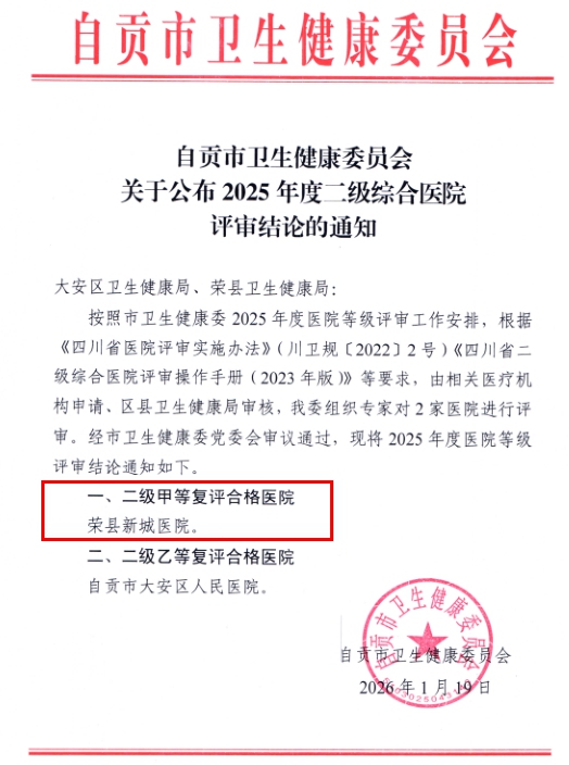 近日,自贡市卫生健康委员会正式公布2025年度医院等级评审结果,荣县新城医院成功通过二级甲等综合医院复审。这标志着医院在资源配置、服务质量、安全管理等方面持续符合高质量标准,不仅是对医院综合实力的权威认可,更进一步巩固了其在区域医疗卫生体系中的核心作用,为提升区域整体健康保障水平提供保障。